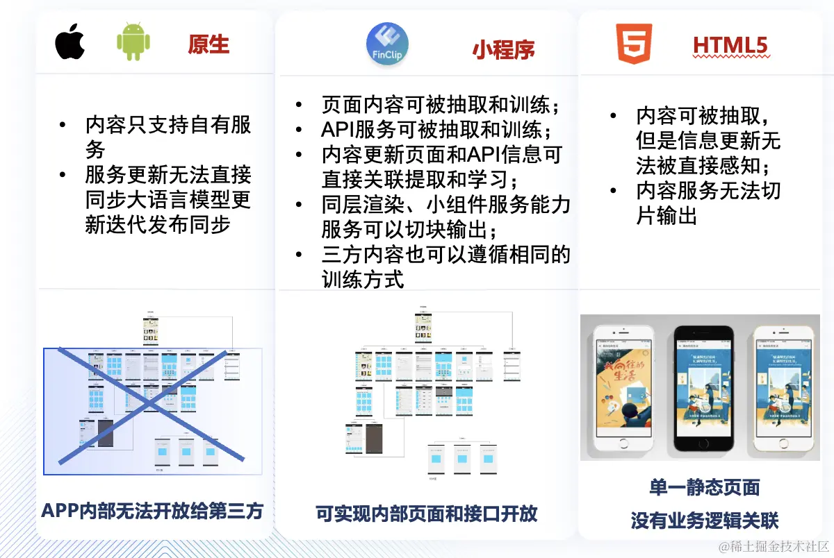 基于LLM的应用推荐,就不会有上述问题。App上的应用,通过推荐语料的关联,平台只需要基于大模型训练后的推荐,前端结合AI助手进行更智能的推荐,加上小程序技术天然可以将应用场景以定位到某个具体页面,甚至页面中组件的形态呈现在客户面前。