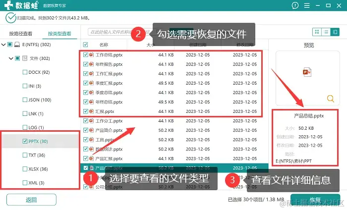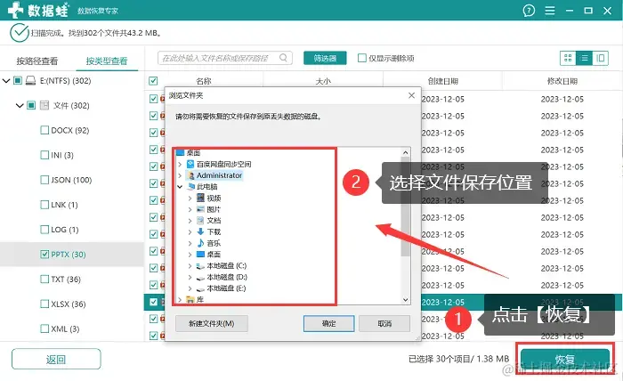 步骤3:将所有文件都定位完毕后,可以将需要恢复的文件都勾选上,并点击【恢复】,选择一个合理的保存位置保存恢复后的文件。