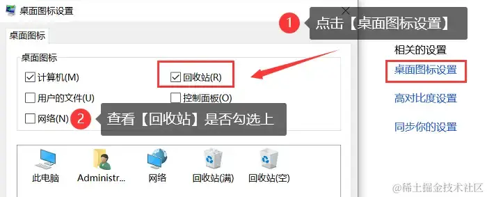 步骤4:在桌面图标设置窗口中,确保【回收站】 的复选框是勾选的;