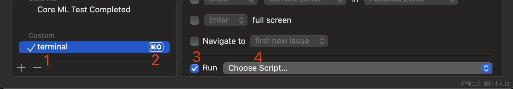 然后输入自定义的 Behavior 名称(图中的 1),并指定一个快捷键(图中的2,最好不要和已经有的快捷键冲突,不然可能不生效)。然后勾选上图右侧的 Run(图中的3), 并双击 Run 右侧的下拉框(图中的 4 ),选中刚才创建的 terminal.sh文件: