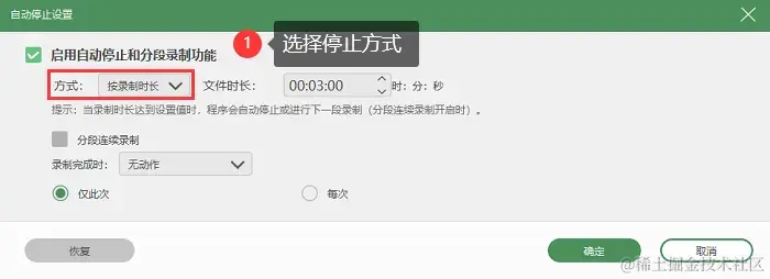步骤3:软件还提供了自动停止设置功能,可以按照文件大小、录制时长和停止方式来结束视频录制,并设置完成时的动作。