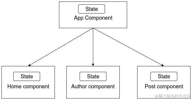 考虑我们在前一章创建的博客应用。我们有一个App 组件作为父组件,所有其他组件都是App 组件的子组件。在我们的情况下,每个组件都有自己的状态,如下所示: