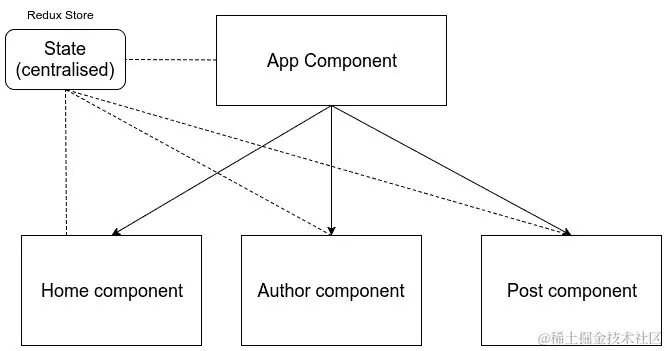 如果我们使用 flux,它将具有多个存储,并且我们可以将Post 组件列表的状态和Author 组件列表的状态作为两个存储,并让整个应用程序共享这些存储。但是,如果我们使用 Redux,它将维护一个单一存储,其中将保存整个应用程序的状态。您的应用程序结构将如下所示: