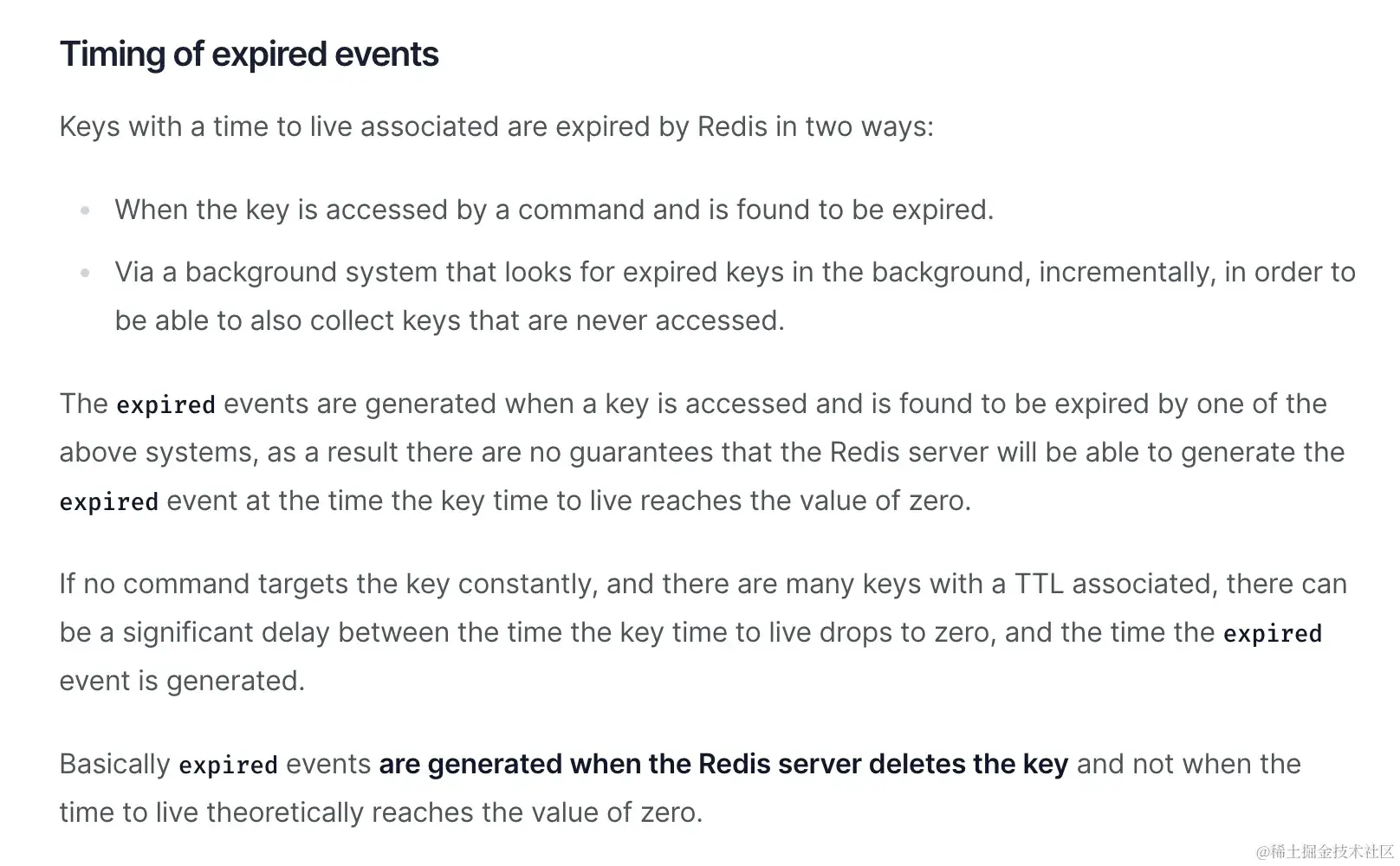 key 的过期事件发布时机并不是当这个 key 的过期时间到了之后就发布,而是这个 key 在Redis中被清理之后,也就是真正被删除之后才会发布。但是 key 过期后并不是立刻删除的,它分为两种惰性删除和定期删除,所以这个有可能会存在延迟,不够精确,尤其是在高负载的情况下。