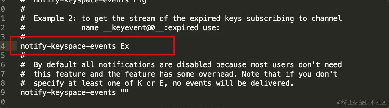 在 Redis 配置文件 redis.conf 中增加一条配置 notify-keyspace-events。