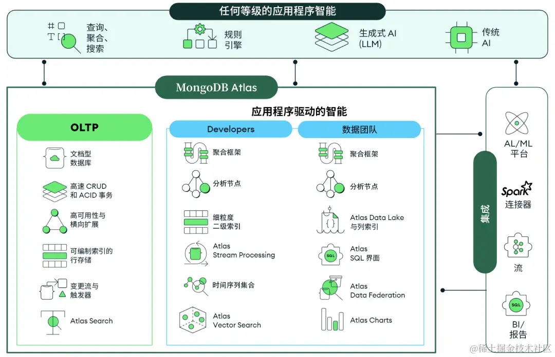 Atlas 支持任何级别的应用智能,从查询记录和通过语义与关键词搜索来检索信息到聚合和转换数据,提供基于规则的引擎和特征存储,直到使用实时数据增强LLM 和传统AI 模型。Atlas 会自动优化数据的获取、处理和存储方式,最大限度地提高应用程序的操作、AI 和分析工作负载的效率。这些功能全部打包在一个巧妙的集成式多云数据架构中。