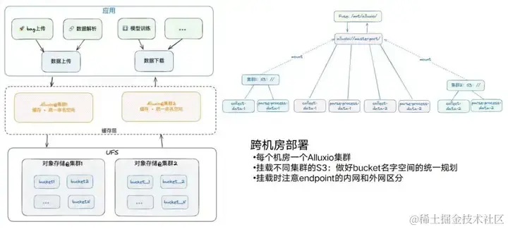 但是由于各种各样的原因,我们还会有跨机房的存在。现在有两个机房,每一个机房里都会有对应的 S3 服务,也会有相应的 GPU 计算节点。基本上每一个机房我们都会部署一个Alluxio。同时在这个过程中也要注意,一个机房里可能是两个Alluxio的对象存储,另外一个机房如果也要做 S3 挂载,尽量做好 bucket 名字的统一规划,不能把两个搞重了。比如这里有个bucket 1,那里又有一个bucket 1,会导致Alluxio挂载时的一些问题。