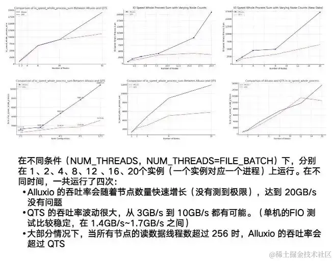 而Alluxio这边,整个测试过程,节点随着运行实例的增加,可以达到一个非常高的上限,我们当时设到 20GB/s时,它都还是呈现出一直向上的趋势。这说明Alluxio整个并发的、分布式的性能非常好。