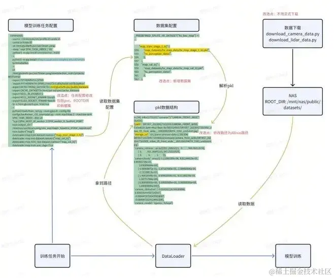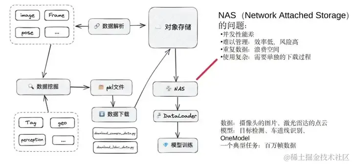 我们聚焦到模型训练来讲:模型训练主要是通过数据挖掘拿到数据,从而生成一个数据集。数据集在内部是一个 pkl 文件,包含数据、channel、存储位置,最后数据算法训练的同学会自己写下载脚本,把数据从对象存储拉到本地。