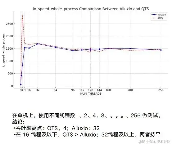 其实真正体现Alluxio优势的是多主机上、分布式的能力。可以看到 NAS 或者我们举例的QTS,它有一个非常明显的点:不稳定。测试3G 到 10G 间波动会比较大,同时它有一个明显的瓶颈,达到 7/8G 左右,就基本上稳定了。
