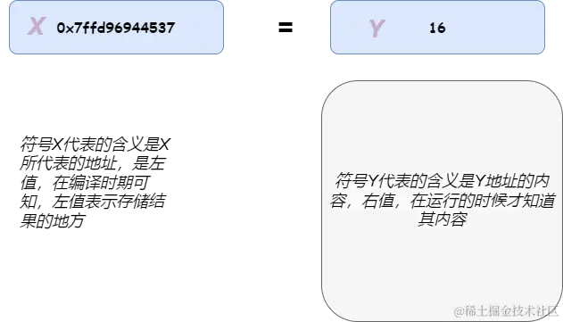 出现在赋值符左边的符号有时被称为左值(由于它位于“左手边”或“表示地点”),出现在赋值符右边的符号有时则被称为右值(由于它位于“右手边”)。编译器为每个变量分配一个地址(左值)。