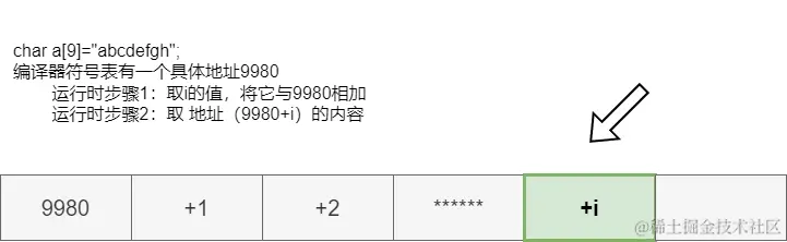 编译器已被告知p是一个指向字符的指针(相反,数组定义告诉编译器p是一个字符序列)。pli]表示“从p所指的地址开始,前进i步,每步都是一个字符(即每个元素的长度为一个字节)”。如果是其他类型的指针(如int或double等),其步长(每步的字节数)也各不相同。
