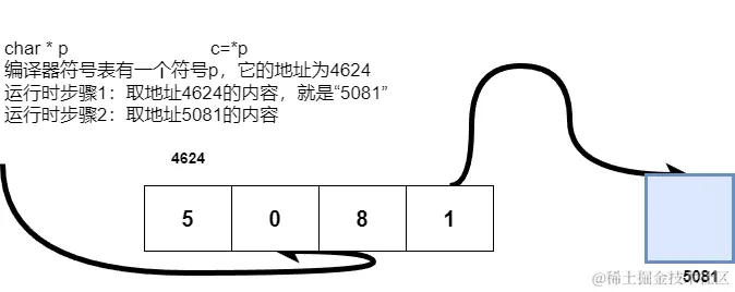 - 取得符号表中p的地址,提取存储于此处的指针