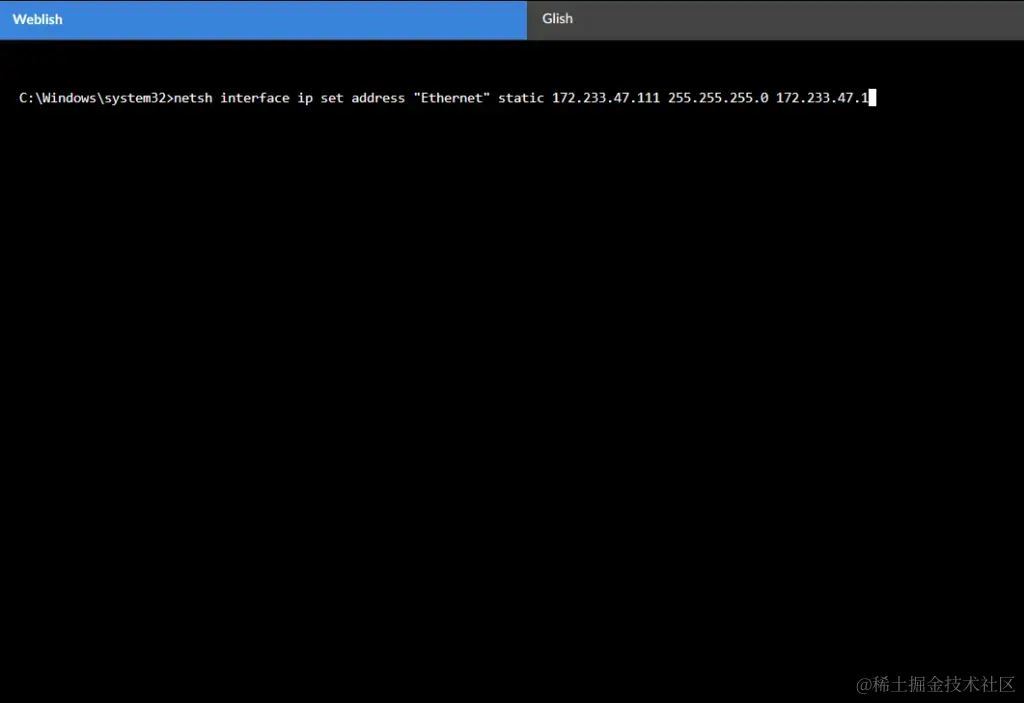 netsh interface ip set address "Ethernet" static 172.233.47.111 255.255.255.0 172.233.47.1