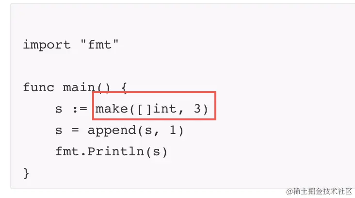 踩坑分析: 一般来说,slice的初始化为 make([]T, length, capacity)。 如果省略了capacity,默认capacity等于length。因此上面建了一个[]int类型的切片,长度和容量为3的[0,0,0]切片,因此通过append(s,1)会使slice扩容成6,并添加元素1进去。输出结果为:[0,0,0,1]