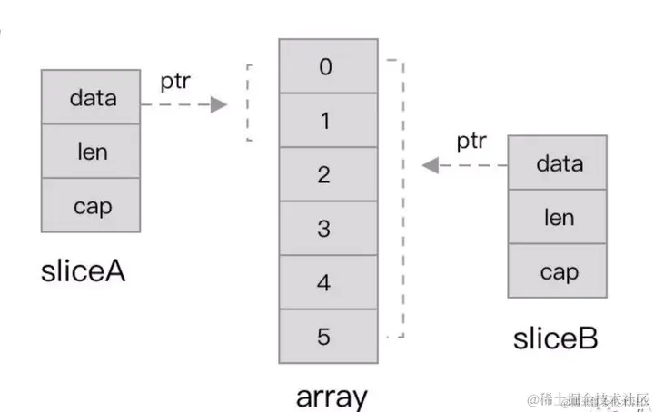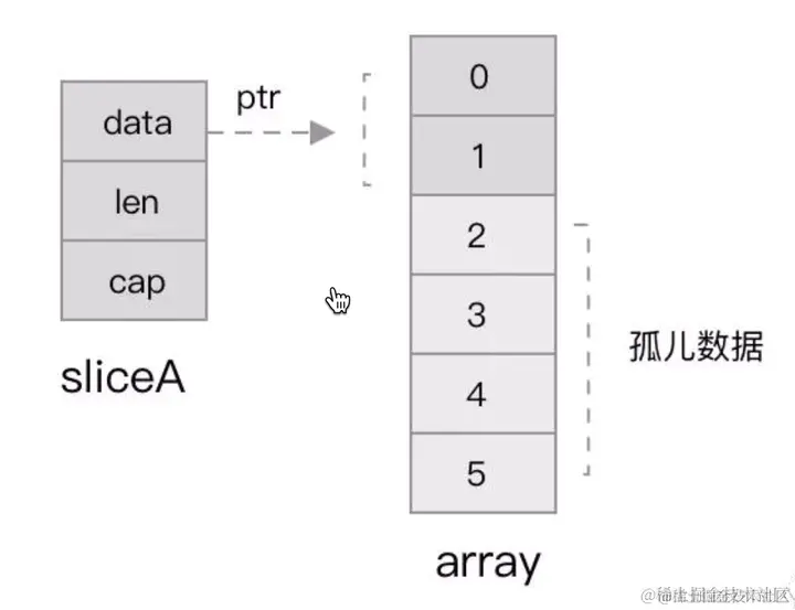 踩坑分析: 因为切片的截取是引用关系,共有 2 个切片 a 和 b,截取了 a 的一部分赋值给了 b,两者存在着关联。图3-2-1 因此,虽然切片 a 只有底层数组中 0 和 1 两个索引位正在被使用,其余未使用的底层数组空间毫无作用,图3-2-2。但由于正在被引用,他们也不会被 GC,因此造成了内存泄露。