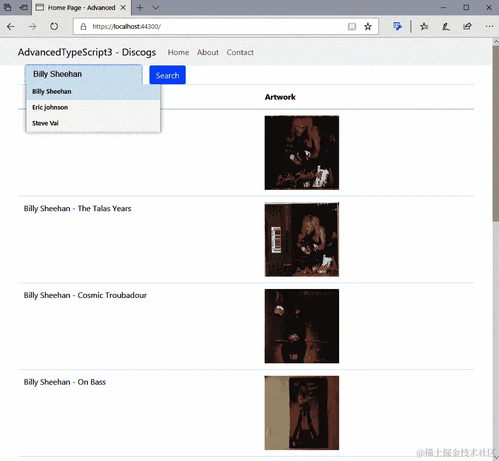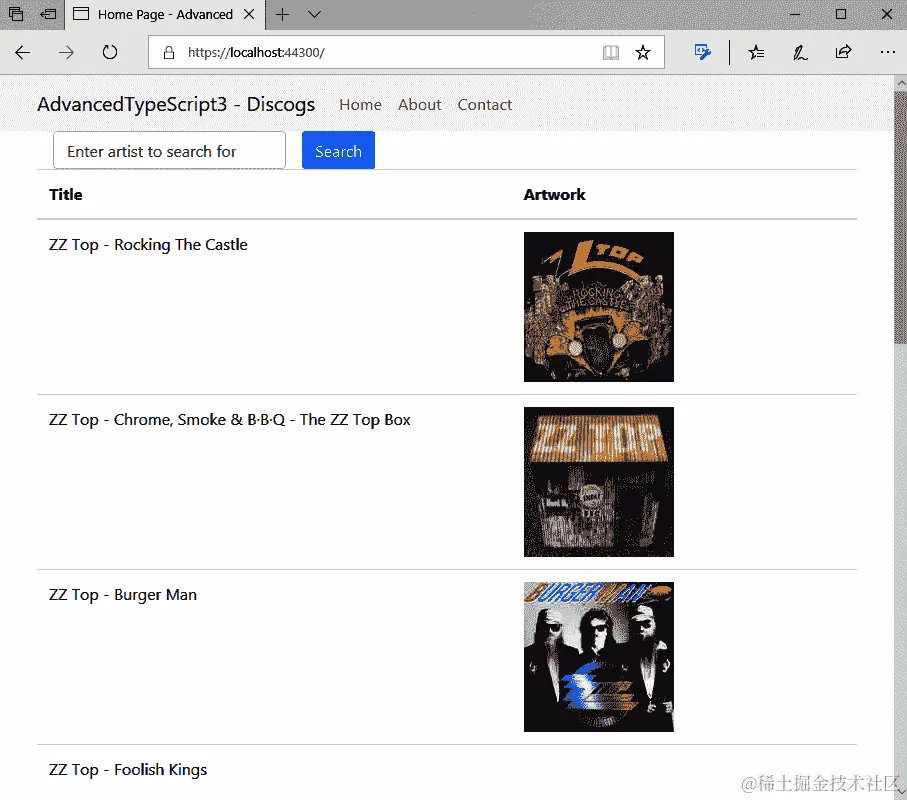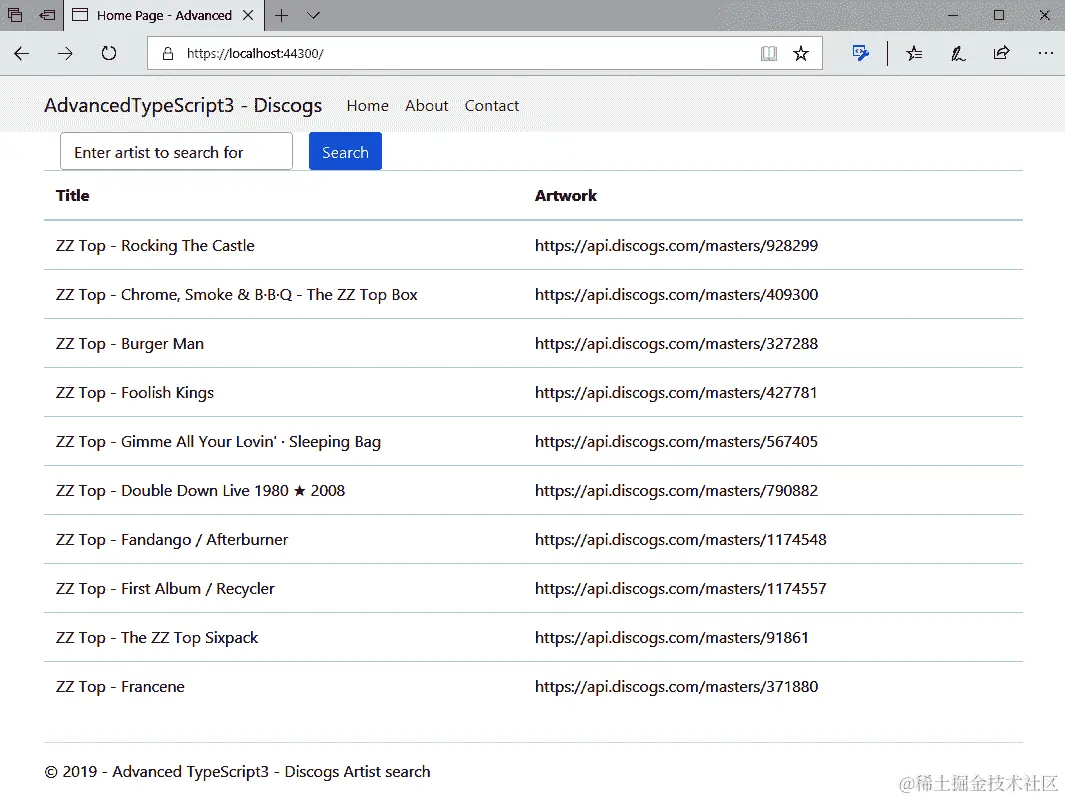 本章我们正在构建的项目与我们迄今为止编写的任何项目都大不相同。这个项目让我们远离了纯 TypeScript,转而使用混合编程语言,即 C#和 TypeScript,我们将看到如何将 TypeScript 整合到 ASP.NET Core Web 应用程序中。该应用程序本身使用 Discogs 音乐 API,以便用户可以搜索艺术家并检索其唱片和艺术作品的详细信息。搜索部分使用纯 ASP.NET 和 C#完成,而艺术品检索则使用 TypeScript 完成。
