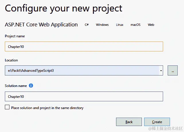 E:\Packt\AdvancedTypeScript3下,所以将其作为我的位置告诉 Visual Studio 在该目录下的一个文件夹中创建必要的文件。在这种情况下,Visual Studio 将创建一个名为Chapter10的解决方案,其中包含我们所有的文件。点击创建以创建所有我们需要的文件: