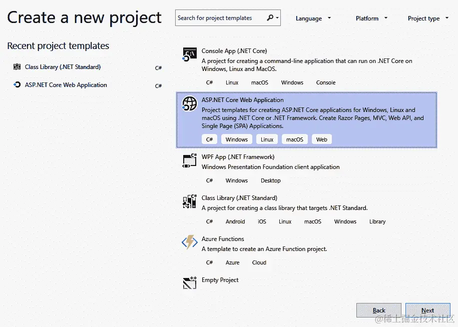 - 打开 Visual Studio 并选择创建新项目以开始创建新项目的向导。我们将创建一个 ASP.NET Core Web 应用程序,如下所示: