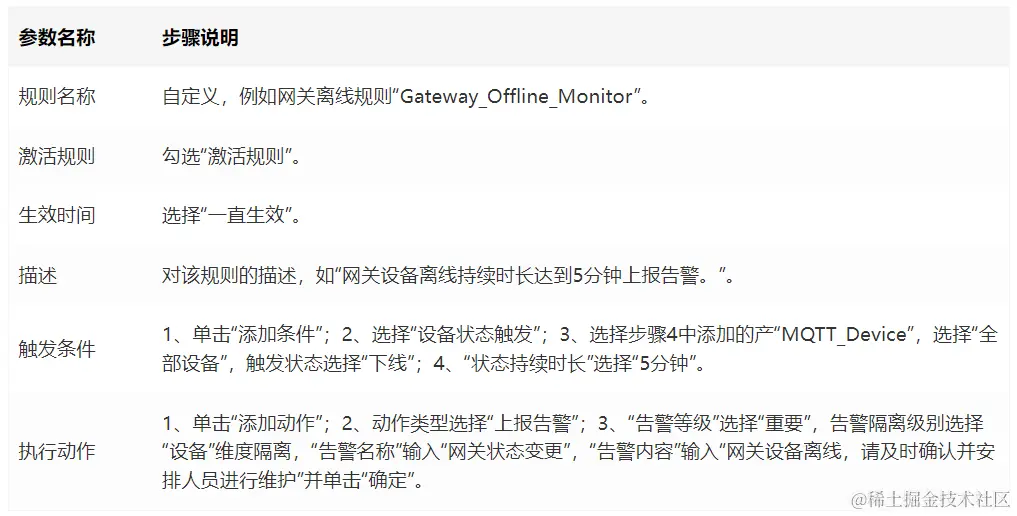 参考下表参数说明,填写规则内容,创建网关离线上报告警规则。以下参数取值仅为示例,您可参考用户指南创建自己的告警规则,填写完成后单击“创建规则”。