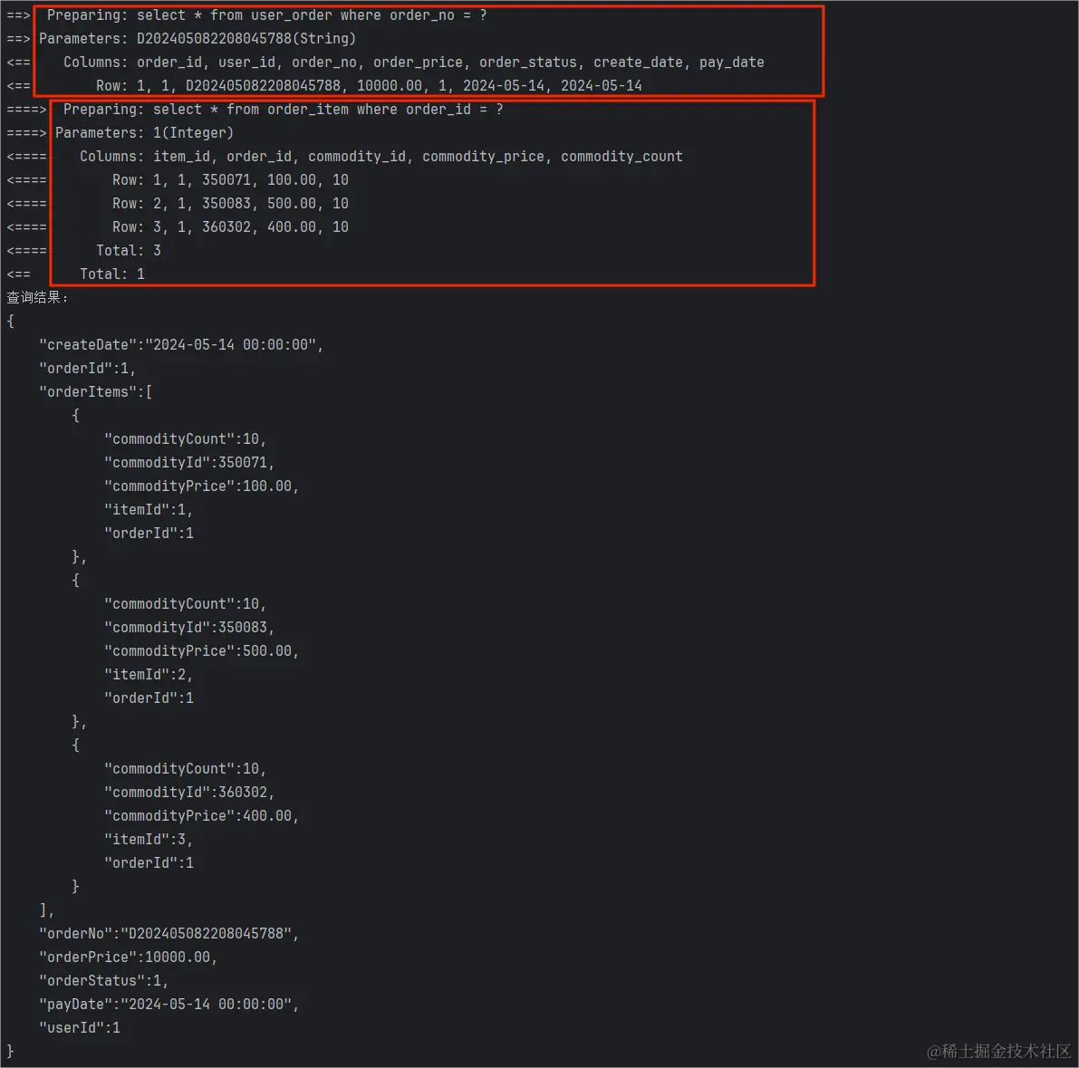 UserOrderDO userOrder = userOrderMapper.selectUserOrderAndOrderItemsByOrderNoNest("D202405082208045788");