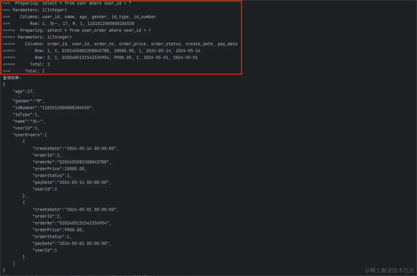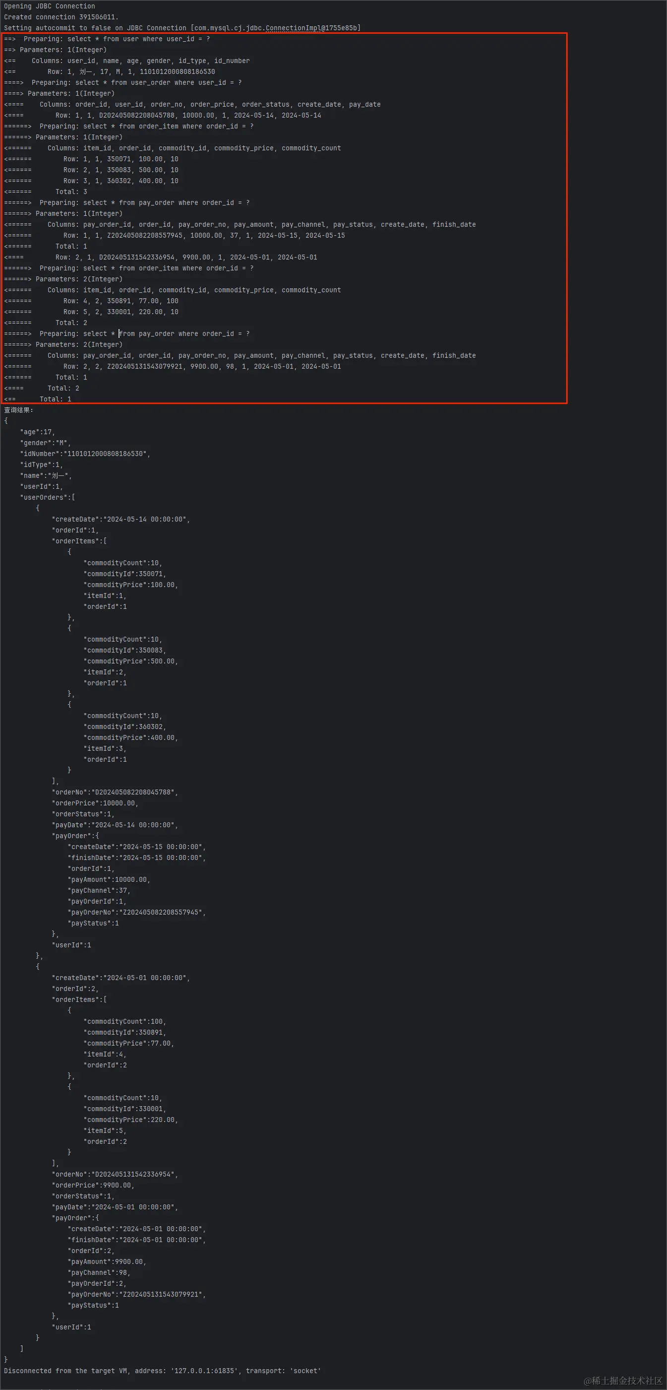 可以看到在输出的查询语句中,比我们想象中的要多,这是因为该用户有两个订单,而我们嵌套的子查询语句只允许传入单个订单 ID,因此需要根据订单 ID 查询多次支付订单信息和订单明细信息。