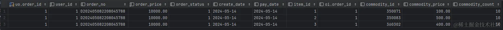 但是执行完 SQL 语句之后你有点懵了,数据库的查询结果给出了 3 条数据,这与我们设想的一条订单信息带 3 条订单明细也不一样啊?