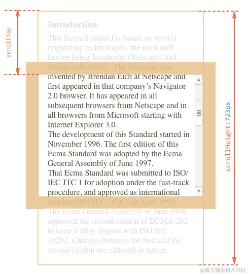 scrollWidth和scrollHeight:这些属性返回元素内容的总宽度和高度,包括溢出隐藏的部分,即所有的内容加上padding和border,但不包括margin。如果元素有溢出或设置了overflow属性,这些值可以反映出元素的实际尺寸,即使它们不在视窗中可见。 -