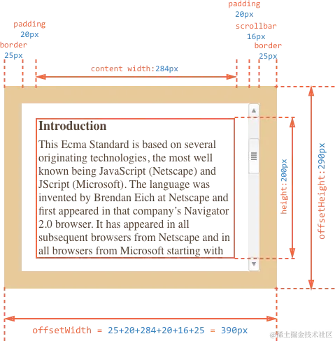 offsetWidth和offsetHeight:这些属性返回元素的可见宽度和高度,包括内容、内边距(padding)和边框(border),但不包括外边距(margin)。如果你希望隐藏滚动条,或者需要获取布局尺寸而不包括可见滚动条,这些属性非常有用。