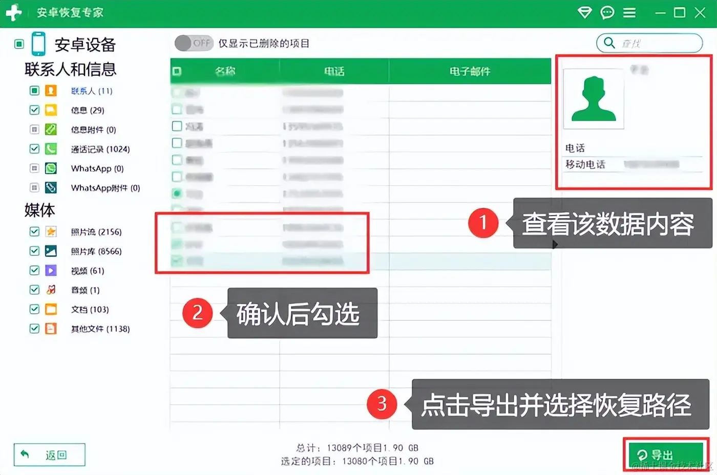 第三步:它使用先进的数据分析技术,帮助我们深度扫描手机数据,当扫描完成之后,我们就可以查看数据,然后选择并导出到电脑的指定位置中!