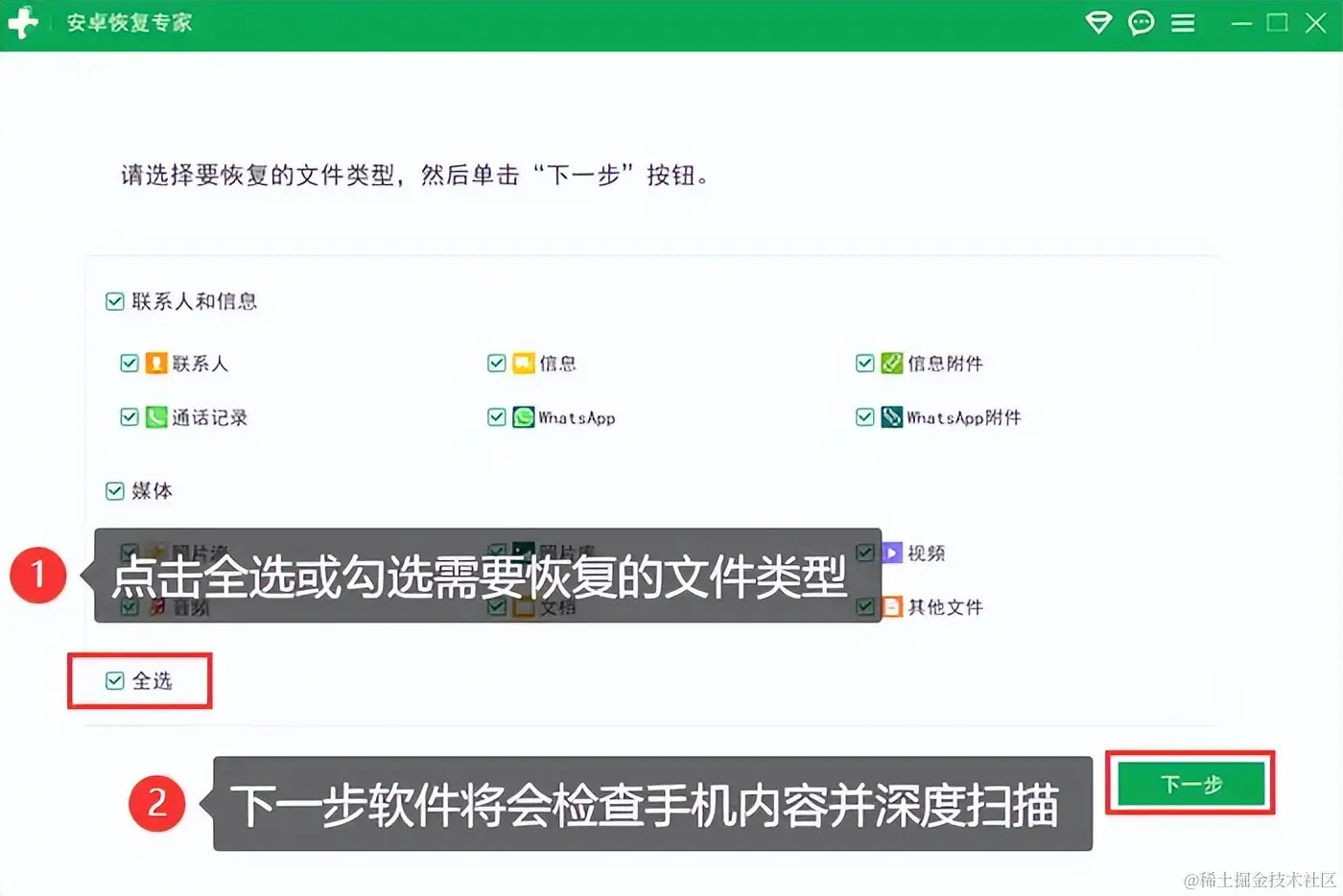 第二步:它支持多种数据类型的恢复,包括但不限于联系人、照片、短信等,我们需要在软件界面中勾选需要恢复的文件类型,然后点击 【下一步】 即可。
