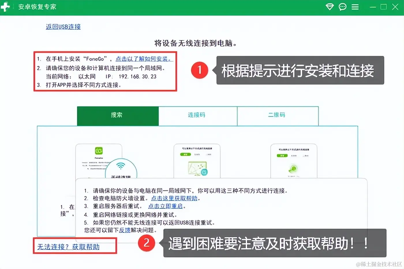 第一步:该工具使用不要求我们具备专业知识,我们只需要先在电脑上下载软件并安装,然后根据要求在手机上安装相应程序,以便连接手机和电脑。如果连接不上,我们可以随时点击蓝色字体获取帮助,调整手机和电脑设置。