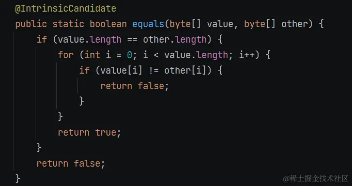 COMPACT_STRINGS是一个静态布尔字段,表示字符串是否使用压缩模式。如果COMPACT_STRINGS为false,则跳过此检查。如果为true,则进一步检查this.coder是否等于aString.coder。coder字段表示字符串的编码方式,可能是 LATIN1 或 UTF16。只有当编码方式相同时,才有可能是相等的字符串。- 最后调用方法进行字符遍历