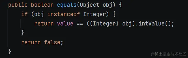 equals 方法会先判断你是否为 Integer 类,如果不是 return false 如果是 Integer 类型,那么就会直接转换为 int,也就是拆箱(换为 Integer 类型,再进行拆箱处理),最后判断值是否相等。所以 Integer 的 euqals