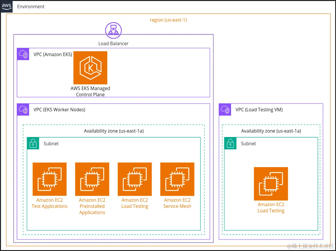 所有测试都在单独的隔离环境中执行。这些环境包括一个已安装了测试产品的 AWS EKS 集群,以及一个单独的 VM,用于对我们的测试应用程序进行负载生成。配置了四个环境——一个用于基线,一个用于每个服务网格。这些环境完全相同,部署在同一区域和可用性区域。所有环境中的所有版本和配置都是相同的,并且在整个测试过程中保持不变。所有集群都有四种类型的 c5.large 节点,分别打上污点,以确保在所有环境中调度不可变。