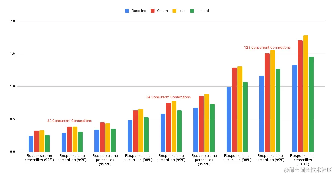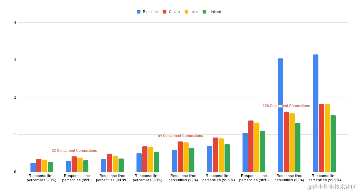 注意:有关在 128 个并发连接的外部通信测试中 Cilium 和基准的异常测试结果的说明,请参阅迭代和改进部分中的 F001 。