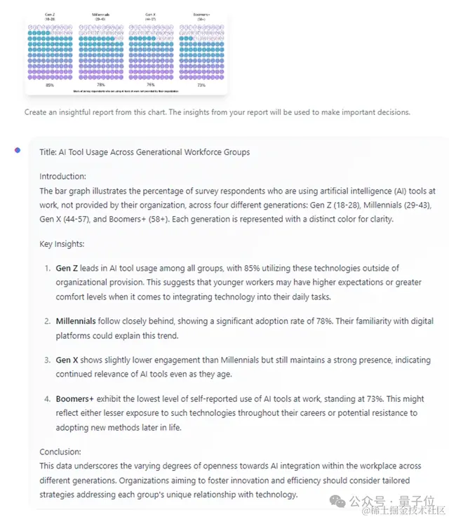 在发布会现场,纳德拉展示了这样的一个 DEMO:把一张图表丢给 Phi-3-vision,内容是关于不同年龄段的人在工作中使用 AI 工具的情况。