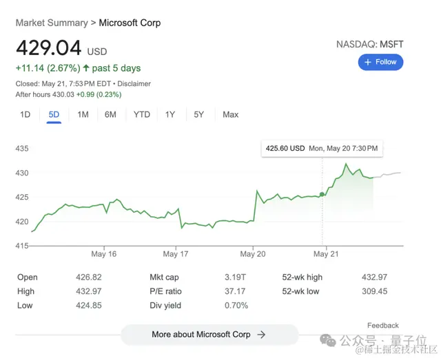 市场上微软股价也是一片向好,一度飙升到了 431.84 美元。该说不说,这两天微软都涨麻了。