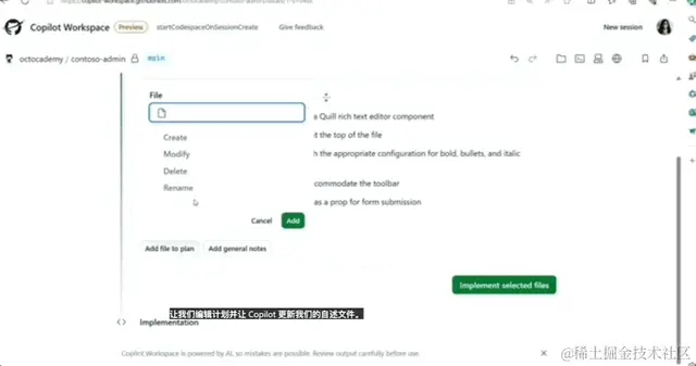 打开 Copilot WorkSpace,可以查看整个代码库,并提出修改建议。Copilot 会自动根据定制进行修改: