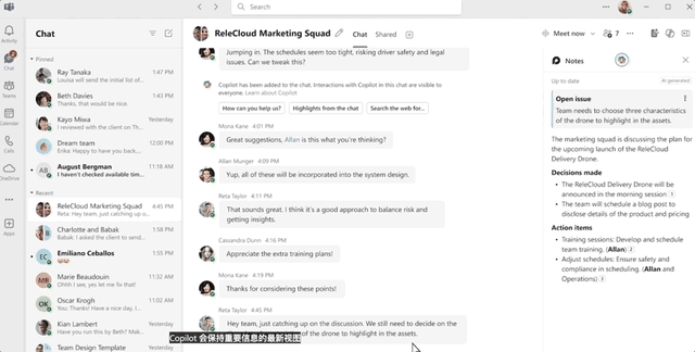 可以把它拉到团队群里面,充当会议主持人,Copilot 可以实时记录下会议中的全部内容: