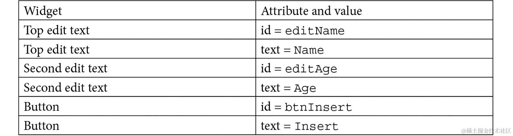 这个简单的布局有两个EditText小部件和一个按钮。用户将输入姓名和年龄,然后点击插入按钮将它们添加到数据库中。