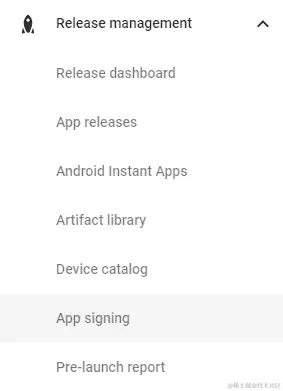 要启用 Google Play 应用签名,请按照前面的步骤准备您的签名 APK,然后打开 Google 开发者控制台。从“发布管理”菜单中可以找到 Google Play 应用签名。