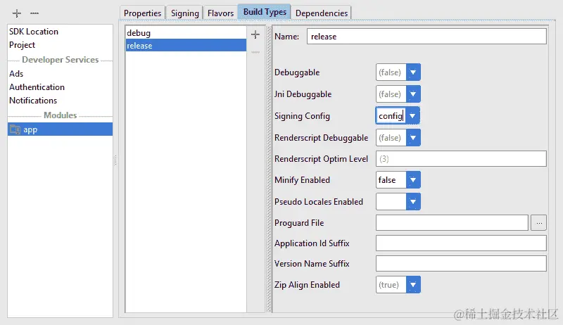 - 接下来,打开“构建类型”选项卡,选择调试或发布类型,输入“签名配置”字段,如下图所示,并进行其他设置,例如启用缩小。