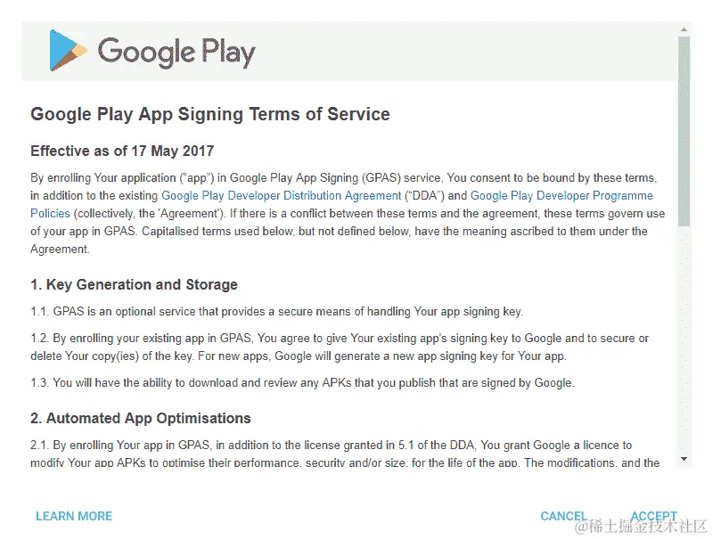 要注册 Google Play 应用签名服务条款,您需要按照这里概述的步骤进行操作: