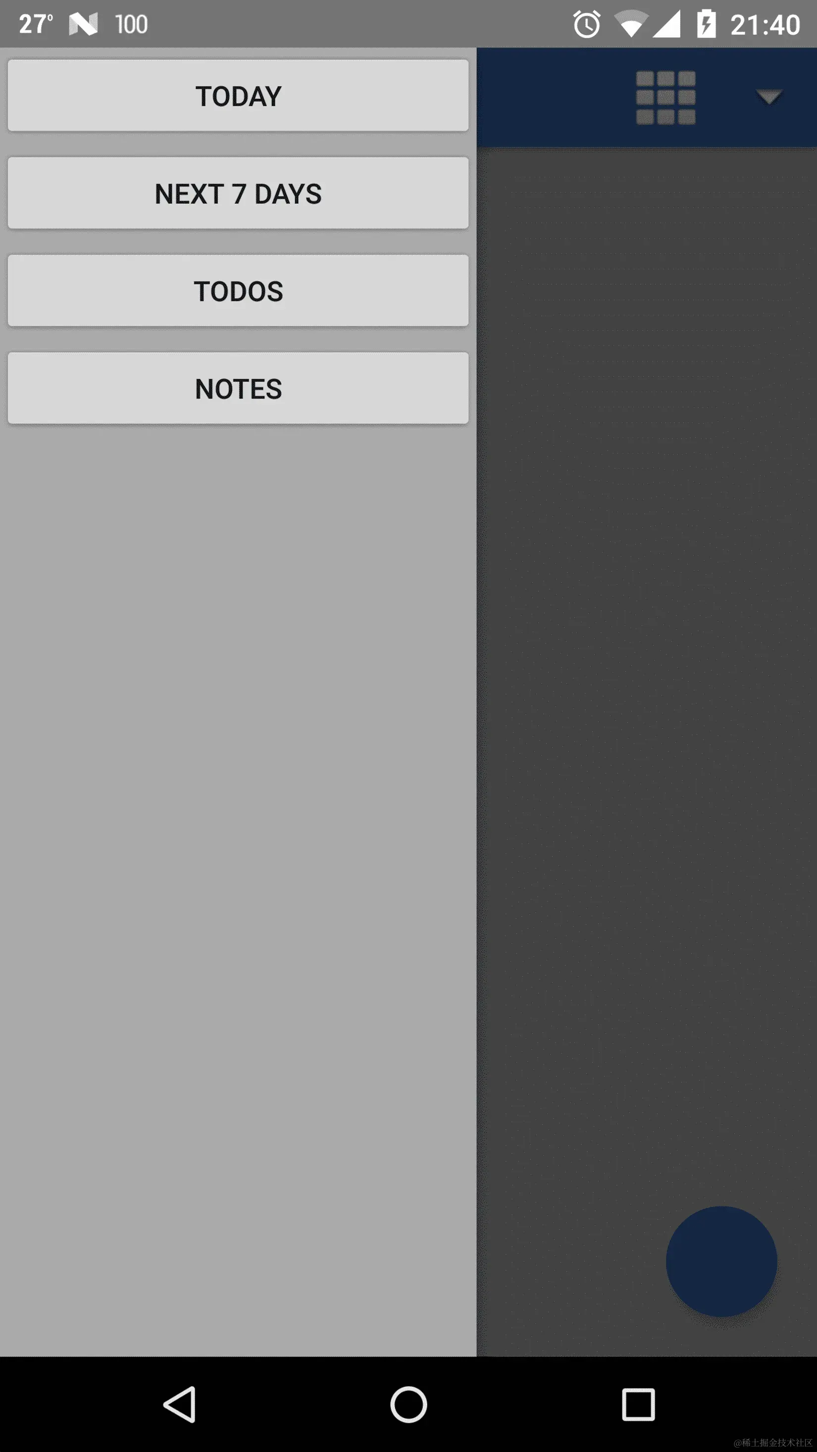 你可能还记得,在我们的模型中,我们已经提出将有链接到过滤数据(笔记和待办事项)的功能。我们将使用导航抽屉来进行过滤。每个现代应用程序都使用导航抽屉。这是一个显示应用程序导航选项的 UI 部分。要定义抽屉,我们必须在布局中放置DrawerLayout视图。打开activity_main并应用以下修改:
