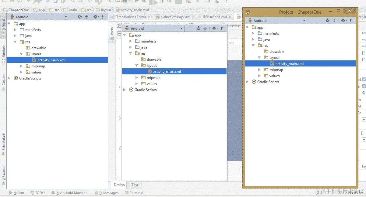 在 IDE 中最重要的窗口当然是我们创建和修改所有应用程序代码的窗口。我们不仅使用编辑器来编辑 XML 和 Java,还有其他编辑器用于简化其他资源,如翻译和主题。然而,无论编辑器多么图形化,所有 Android 资源最终都以 XML 文件的形式出现在res目录中。
