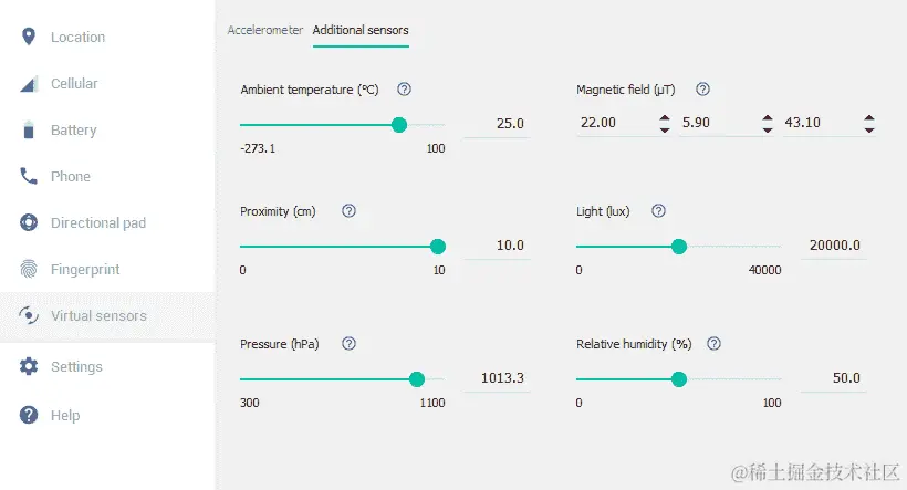 这些扩展控件提供了许多有用的功能,比如轻松设置模拟位置和替代输入方法的能力。我们感兴趣的是虚拟传感器。这些允许我们直接模拟各种传感器和输入值: