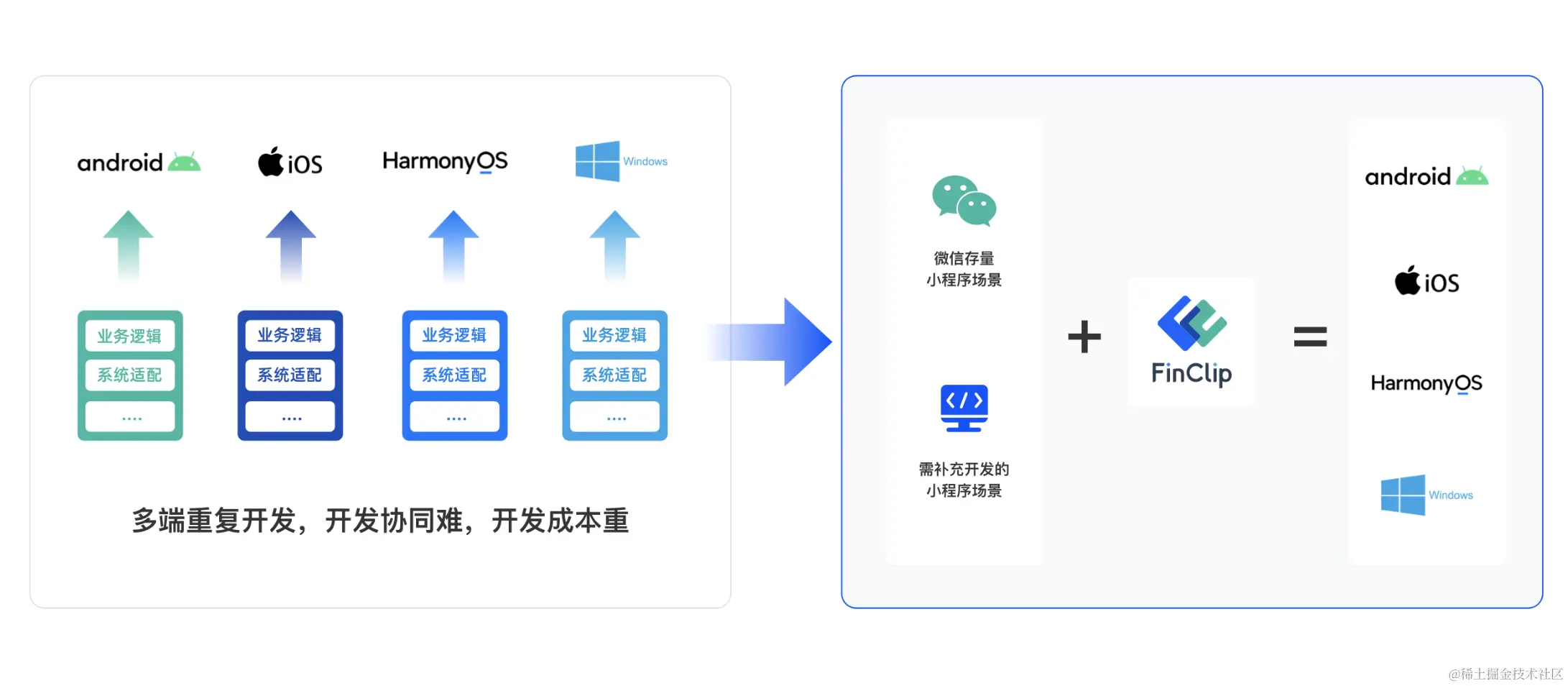 只需简单集成 FinClip SDK , 即可在 HarmonyOS、iPhone、Android、Windows、Linux、macOS、统信等平台下的应用中运行小程序,后续可以通过引入内外部的小程序去快速组装和丰富自己的 App。