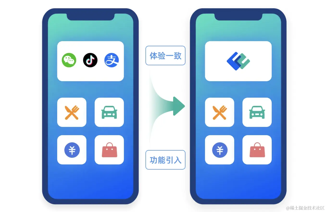 FinClip 支持微信小程序语法 WXML,同时也兼容支付宝小程序及抖音小程序,也就是说微信小程序、支付宝小程序和抖音小程序代码可以直接在 FinClip 复用,无需再二次开发,体验与其在微信、支付宝和抖音 App 保持一致。