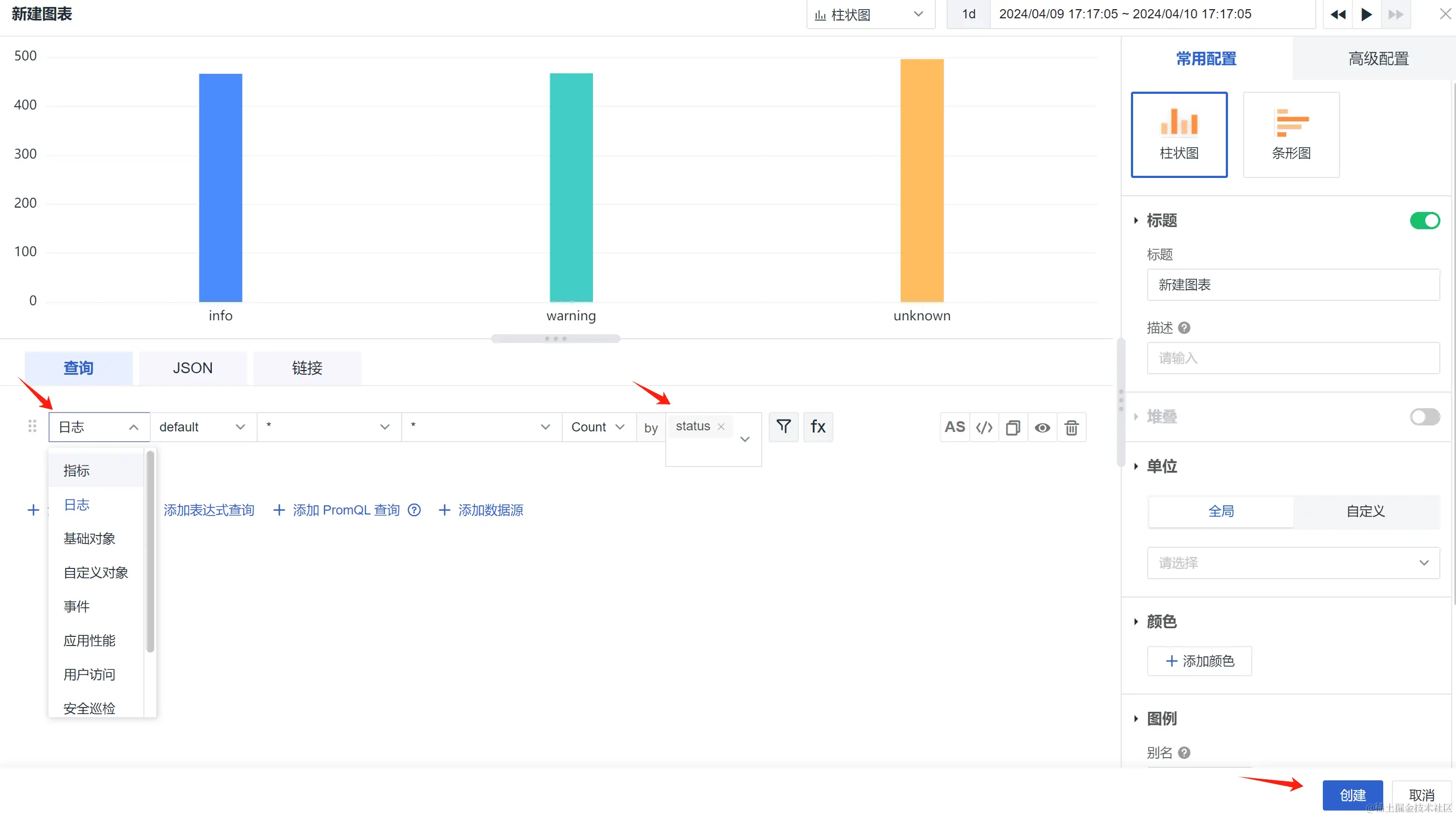 比如,根据前面解析出来的status字段,统计一下 info、warning 状态的日志分别有多少,可以通过以下步骤来创建可视化仪表板。